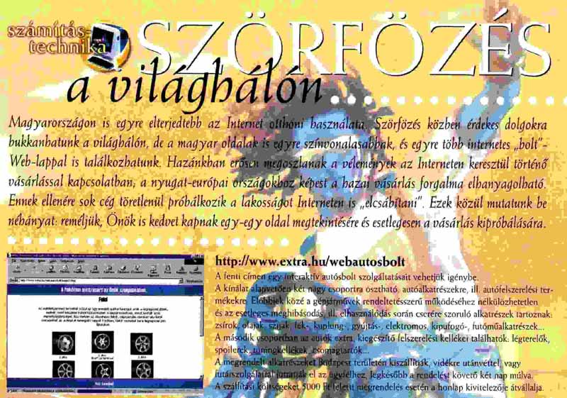 1999. augusztus 22. Felmerül az ötlet, egy saját home page létrehozásáról, melyen keresztül autóalkatrészeket és felszerelési termékeket rendelhetnek egyéni vásárlók és viszonteladók. Kisérletképpen az Extra szerverén helyeztük el első oldalunkat. (Azért esett az Extra-ra a választásunk, mert ez a cég az egyetlen olyan Internet szolgáltató amelyik ingyenesen biztosít tárhelyet kereskedelmi tevékenységet folytató vállalkozások számára.) Az Extra-nak ezúton is köszönetet mondunk ezért a lehetőségért! Felraktuk első saját készítésű lapunkat. Megtekinthető egy régi újságcikk is ebből az időszakból.